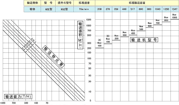 可按照以下簡易選定圖表,選擇機身尺寸、電機容量。但是附著性、磨損性較大的輸送物品,請另行谘詢。最終規格,請根據本公司提交的計劃規格書加以確認。
